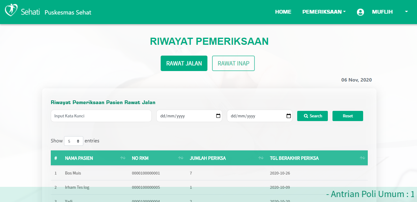 Mencari riwayat pemeriksaan pasien rawat jalan yang sudah pernah dilayani dengan pencarian nama atau tanggal sesuai dengan kebutuhan dan dapat melihat detail hasil pemeriksaan pasien rawat jalan yang sudah dilayani.